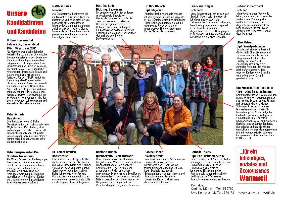 Die Kandidatinnen und Kandidaten der ALW für die Gemeinderatswahlam 07.06.2009 in Wannweil stellen sich vor: